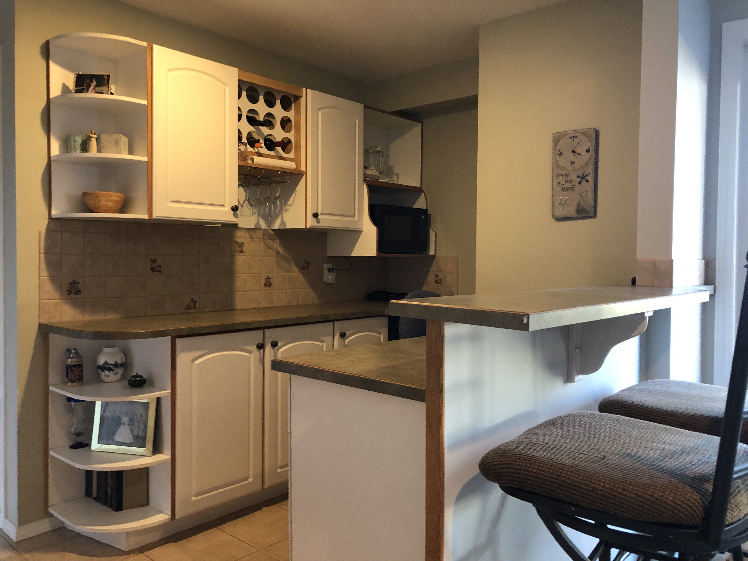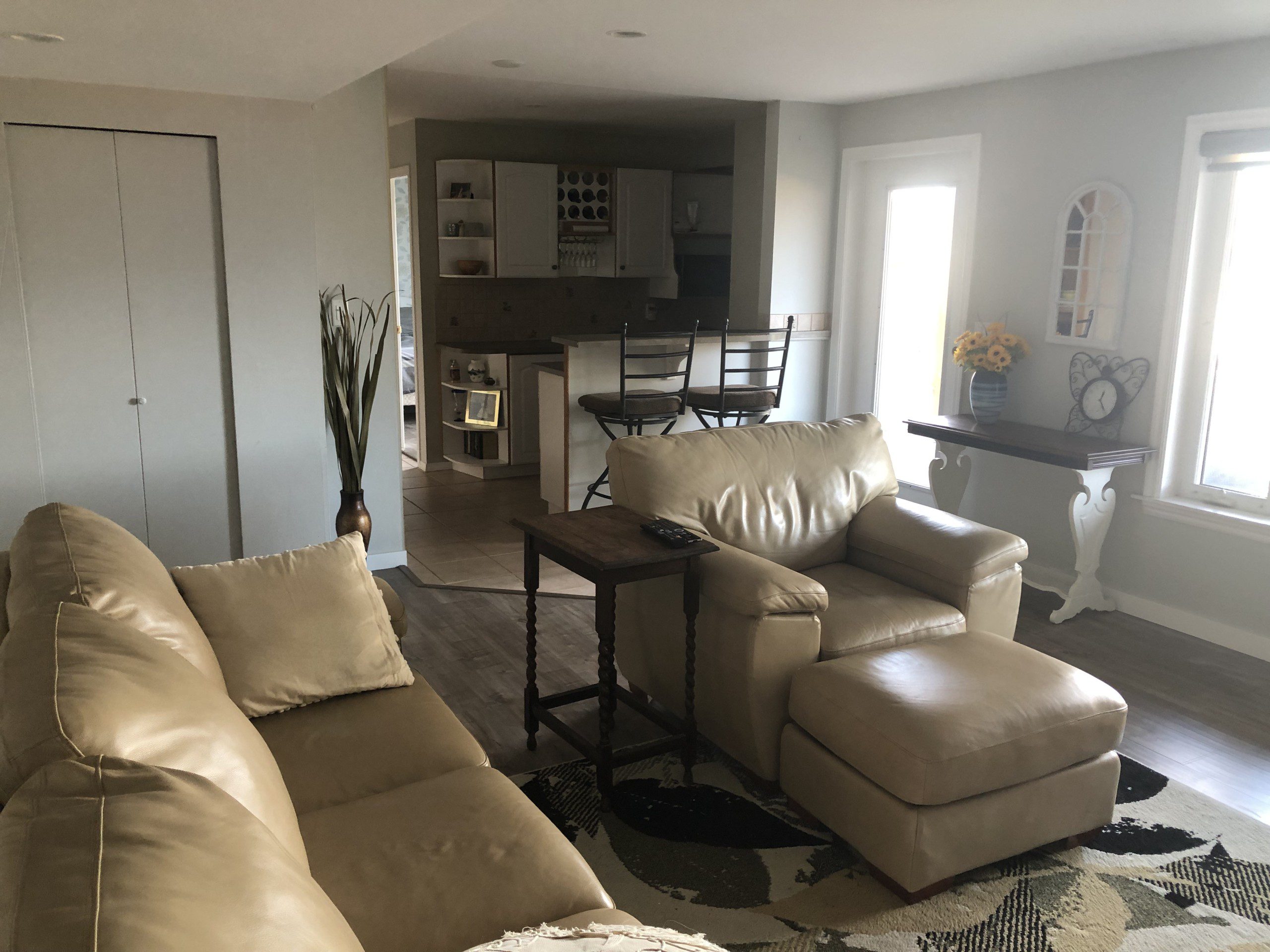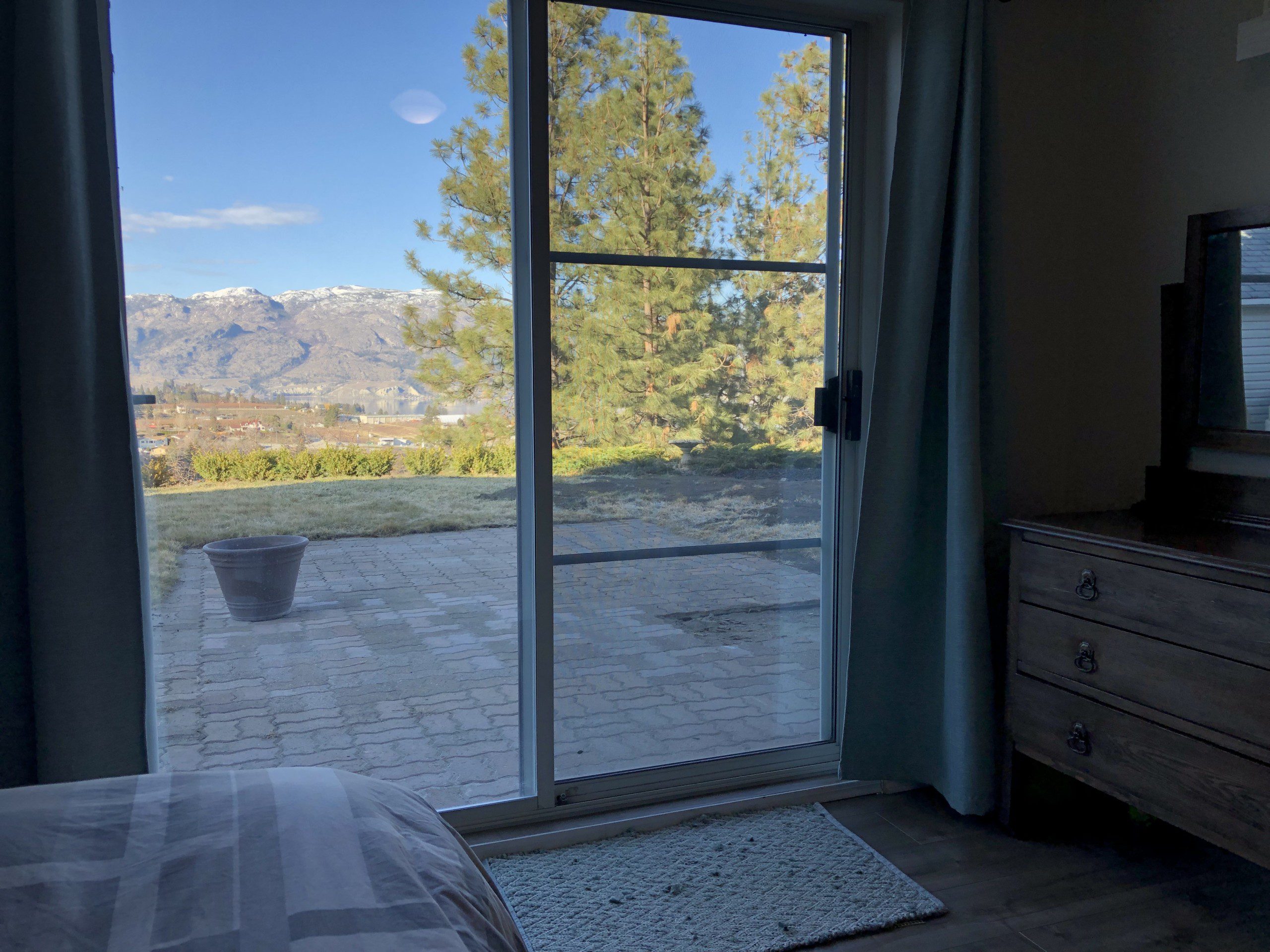 Wake up to gorgeous city and lake views in this fully furnished bright bedroom.  Room comes furnished with a queen bed, armoire, antique dresser and mirror.  Sliding doors lead to a patio for your use to soak up the sun’s rays.  Your bathroom has been newly renovated with glass shower and storage.  Just outside your bedroom door you have a kitchenette with microwave, mini fridge, and coffee maker and a covered seating area outside to enjoy your morning coffee.  Enjoy relaxing evenings curled up in front of a natural gas fireplace in the lounging area complete with 55” TV.