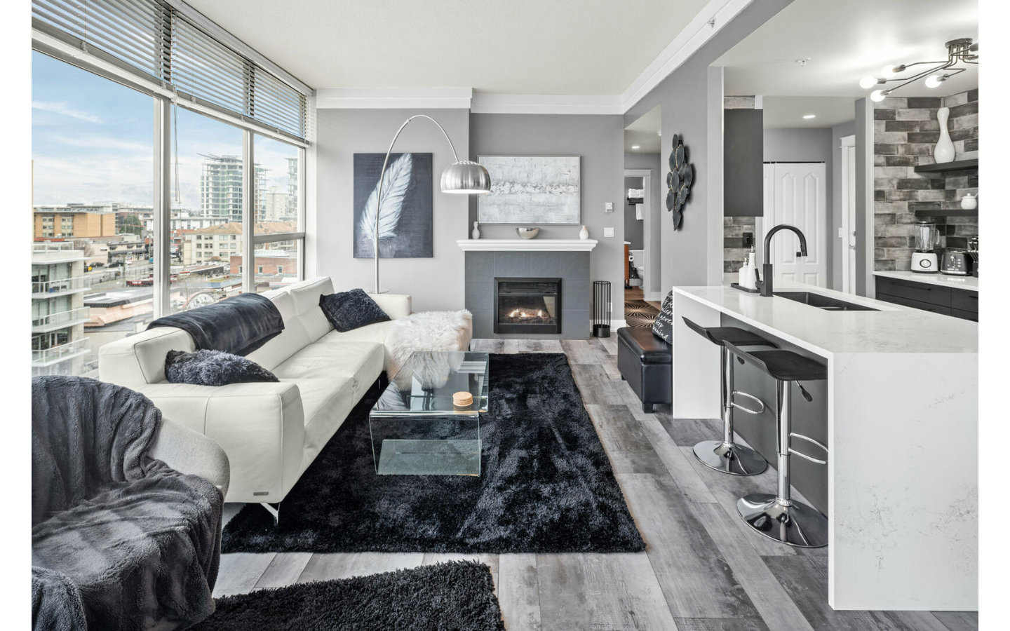 This impressive designer apartment has been lovingly renovated far beyond its original appointments. Cool and calming colour tones, upgraded kitchen with stainless appliances, quartz counters, unique backsplash, wide plank floor and much more. The open concept kitchen, dining, and living area features a cozy fireplace and floor-to-ceiling windows, offering plenty of natural light. This unit also features 9′ ceilings, in-suite laundry, and generous closet space to suit all of your storage needs.